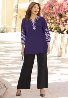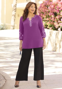 What do you think of when you see dressy casual on an invitation? It’s a dress code that kind of contradicts itself since dressy usually means formal, and casual means, well, casual. For the most part, dressy casual means be comfortable and put together, but please leave your jean shorts at home. Our AnyWear Collection is all about plus size casual wear that’s also on the chic side of things, whether you’re looking for something for a party or date night or casual work outfits. AnyWear dresses, available in midi, maxi or A-line styles, are a safe bet when the occasion is dressy casual. They all have a super-comfortable stretch and a silky-smooth fluid finish. Or if you want a little more relaxed look, you can pair one of our tunics or tanks with a skirt with plenty of swing and sway. It’s easy to show off your personal style with this casual wear that fits in “anywear”.