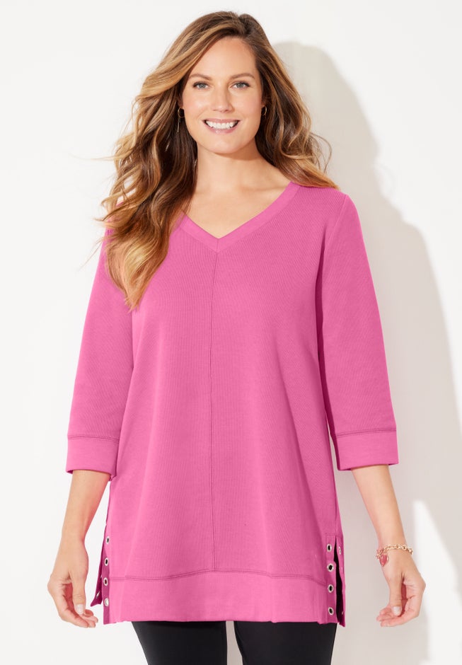 Everyday appeal gets stylishly elevated in the guise of our V-neck top, designed with three-quarter length sleeves, front and back center seam, side snap slits, and contrast trim detail. Perfect with our Everyday Pull-On Pant or Jeans.