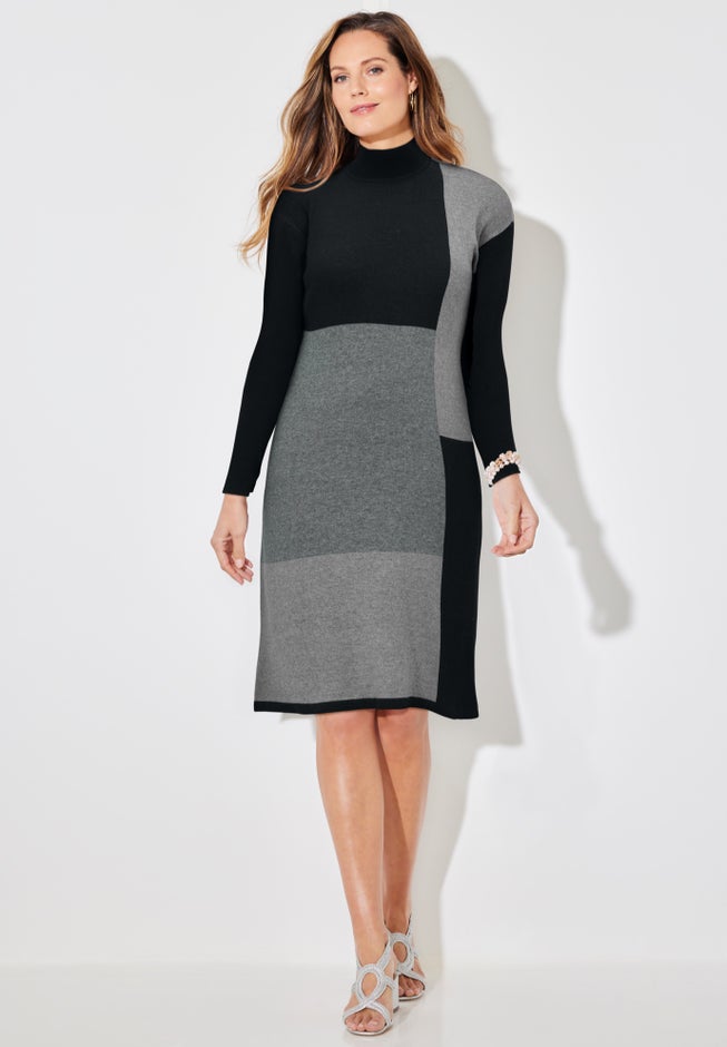 Item Number: 1111022This colorblock sweater dress marries bold contrast with cozy comfort. With a mock neckline, long sleeves, and a sleek mid-calf hem, its equal parts polished and practical. Soft knit fabric makes it perfect for all-day wear — just style with boots and a bag!