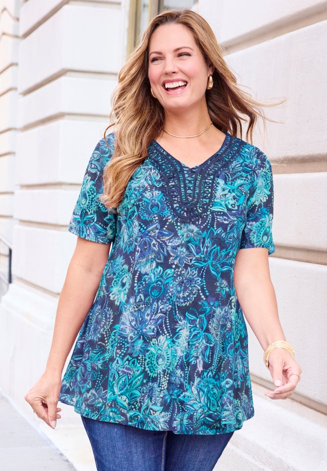 FIT: Easy silhouette with gentle swing and sway. V-neck. Short sleeves. Longer length for added coverage and comfort.