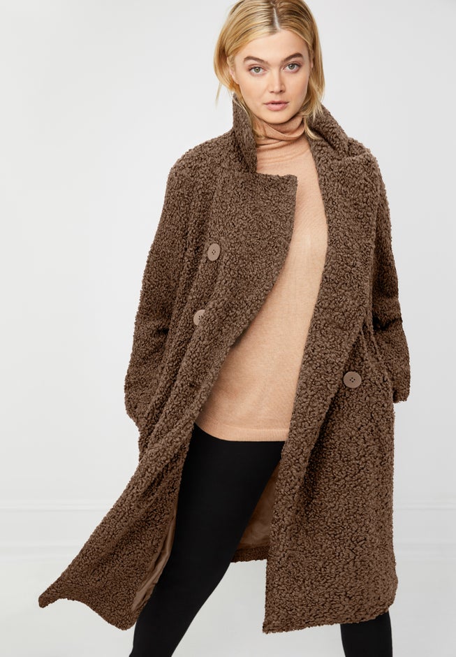The coat that comes with a cuddle of looped faux fur in an enviable color of midnight green. Double-breasted styling with oversized decorative buttons. Deep slant pockets keep your hands cozy.