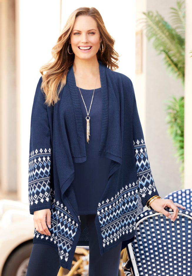 Item Number: 1108573This cozy Fair Isle cardigan is a playful twist on tradition. The soft cotton-blend knit and flowing open-front design make it perfect for layering. Warm, comfy, and never itchy — it’s the cardigan you’ll reach for again and again. Layer it over a turtleneck and leggings for cabin-chic vibes.