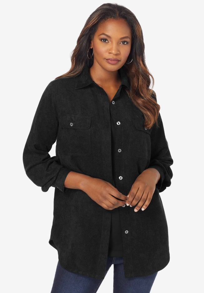 What makes this shirt great is how smooth and easy the faux suede fabric is. Perfect for layering over a tee or tank on chilly days. Button up in a classic shirt with the look and feel of suede. Long sleeves with adjustable button cuffs. A-line silhouette.