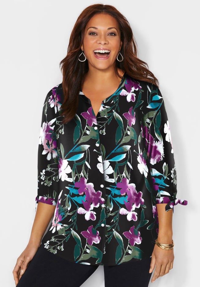 FIT: Easy, feminine silhouette. Notch neck. Buttonfront. 3/4 sleeves with self-tie cuffs. Bust darts provide shape and the perfect fit. Curved hem with side slits.