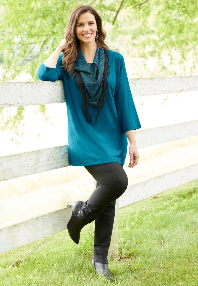 Item Number: 1061114Soft, fluid and so easy to wear, this super-soft marled tunic has a detachable fringe scarf, which fastens in the back via three handy buttons. An updated fashion favorite from our Duet Collection. Even better, it's Impossibly Soft.