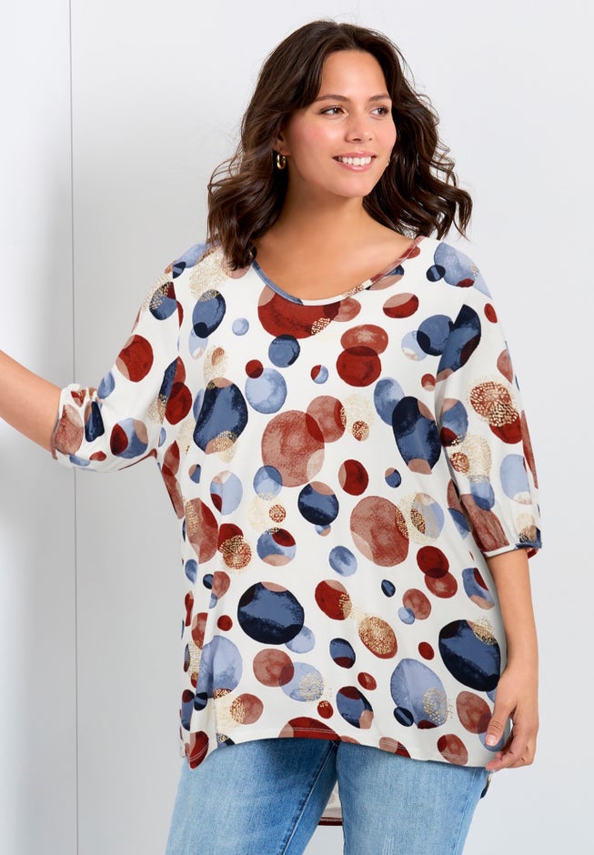 Elevate your style with the Leila Top, featuring a round neckline and 3/4 length elastic cuffed sleeves for a touch of elegance. The flowing relaxed fit and foil print accents add charm to this pullover style top, while its soft stretch knit fabrication ensures comfort. With a below-hip-length hi-lo hemline, this top combines fashion and versatility effortlessly.