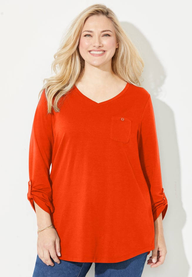 FIT: Relaxed and easy fit. V-neckline. Long sleeves can be converted to 3/4 roll-tab sleeves.