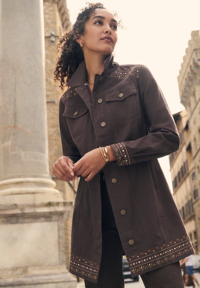 • Long denim jacket silhouette with extended length for added coverage and easy layering