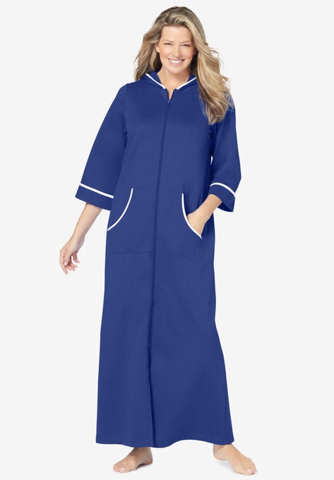 Lounge around comfortably with our long Baby French Terry robe. Perfect to unwind the day in and snuggle in its hood with kangaroo pockets. Three-quarter sleeves with white piping, inside locker loop. Straight bottom hem and 53" length. Baby French Terry, cotton/poly.