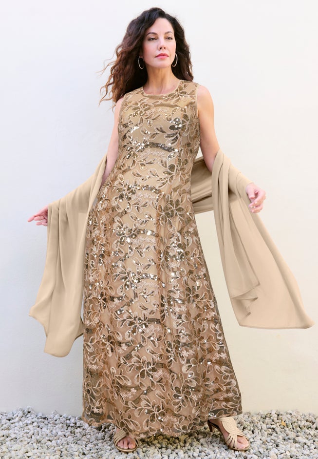 You're sure to steal the show in this striking sleeveless gown with a boat neckline and allover embellishment with a flirty matching shawl. Princess seams, A-Line silhouette, hidden back zip. Lined from the bust down.