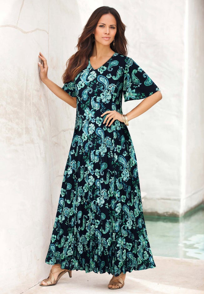 Swing into effortless style with this beautiful V-neck maxi dress made of lightweight crinkle fabric for a breezy look and feel. Pairs perfectly with a denim jacket for the weekend. A-line silhouette, princess seams and flutter sleeves.