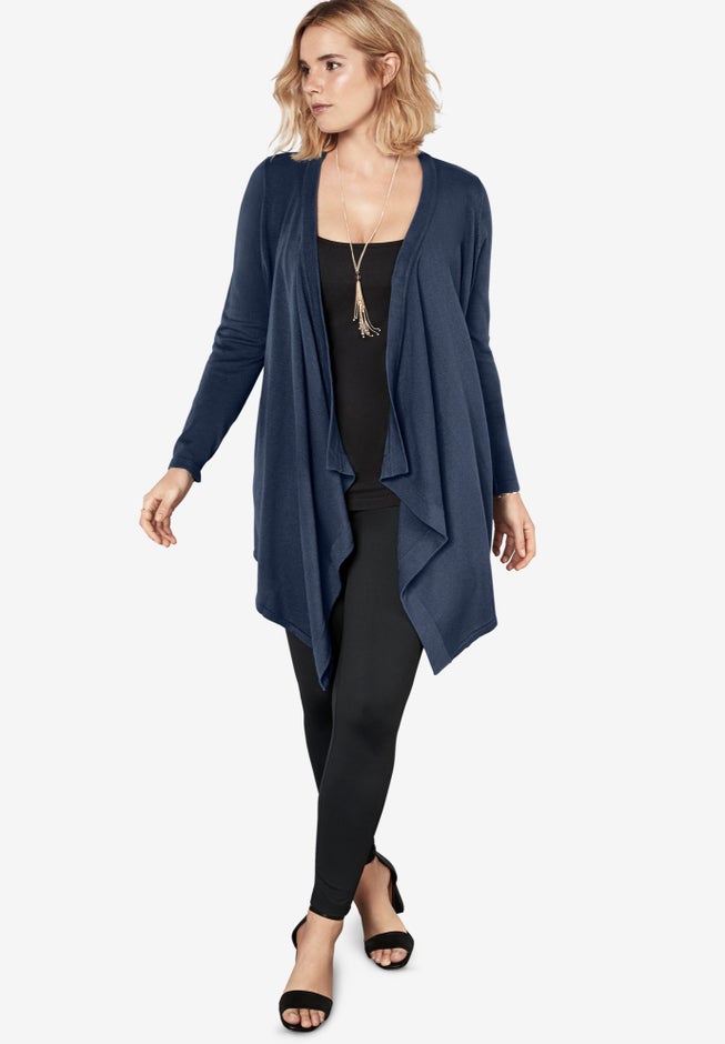 So easy to wear, with the pointed handkerchief hem you love, this versatile cardigan will become the piece you reach for again and again. Draped collar, open front, rib trim. Part of our so-soft Fine Gauge collection, lightweight and easy to wear.