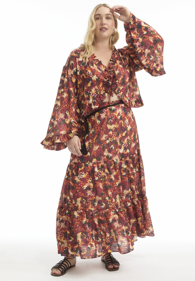 A statement piece for the season, this cropped top channels playful femininity with its romantic ruffles and tie-front design. Flowy flare sleeves and soft structure give it that breezy, fashion-forward feel—perfect for pairing with everything from denim to wide-leg trousers for a modern, trend-right look.
