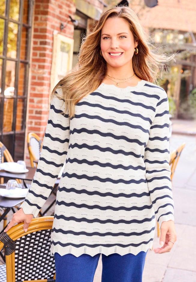Item Number: 1112524Scalloped detailing brings a touch of feminine flair to this cozy sweater. Designed with a wide scoop neckline and bracelet-length bell sleeves, this piece is a polished addition that pairs beautifully with jeans, skirts, or tailored pants.