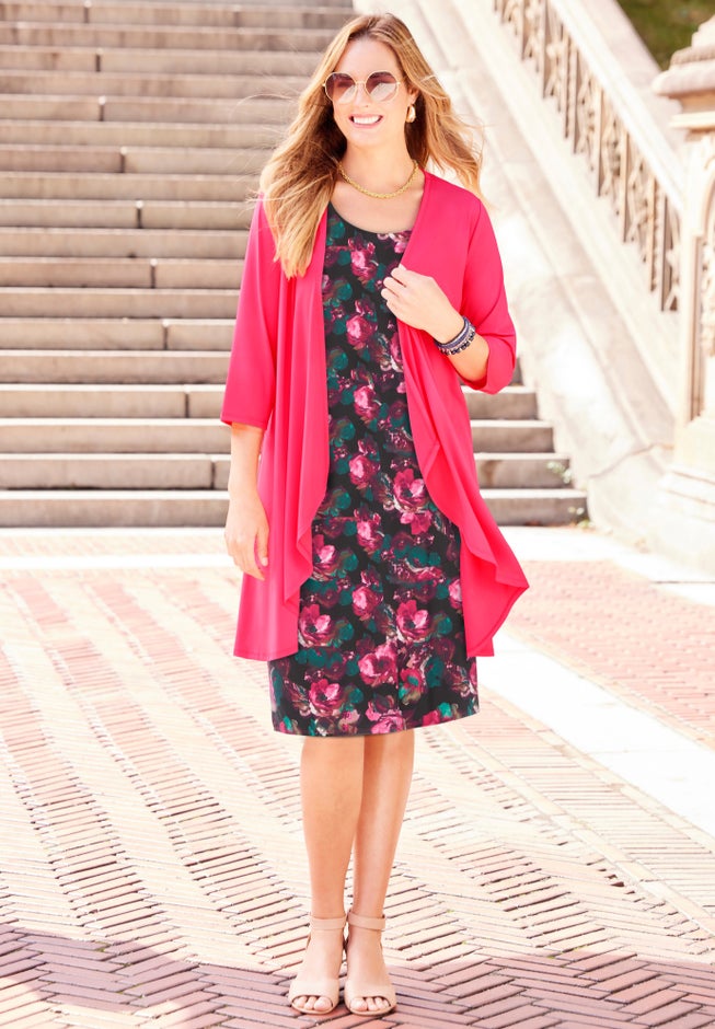 FIT: Dress has a shift silhouette that falls comfortably straight to the hem. Scoop neck. Sleeveless. Bust darts provide shape and the perfect fit. No closure, easy pull-over style. Jacket has a relaxed silhouette with an open, cascade front. 3/4 sleeves. Longer length for added coverage and comfort.