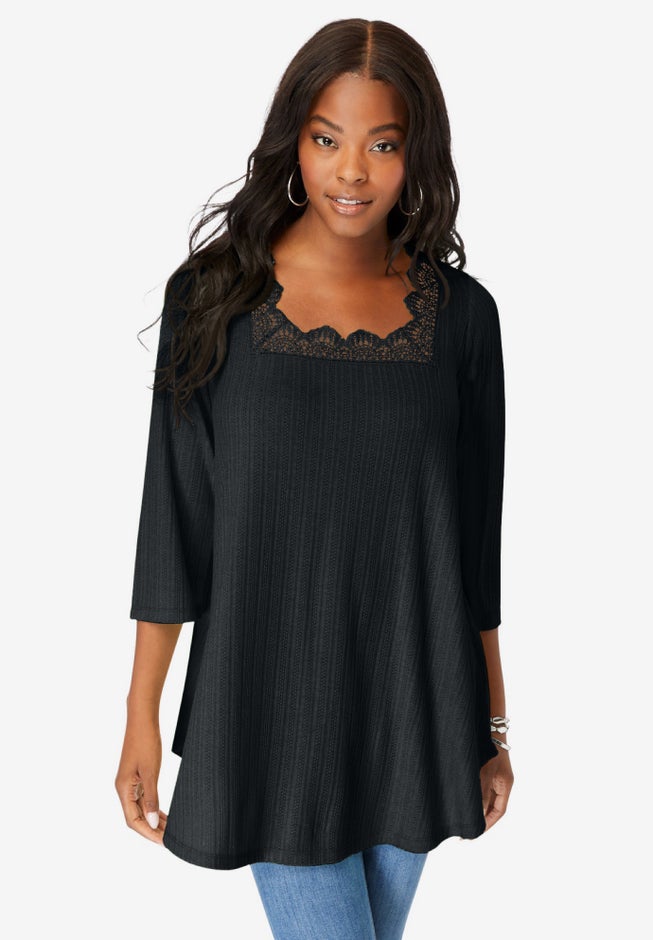 Featuring scallop lace trim along its squareneck design, enjoy the dedication to the details with this pointelle top. An A-line silhouette, three-quarter sleeves, and shirttail hem create a flowy top that looks great untucked over a pair of trousers or jeans.