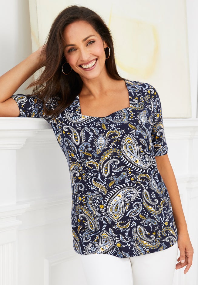 This women's plus size square-neck tee features a clean, tailored silhouette that skims the body with soft structure, thanks to its breathable stretch-cotton blend that holds its shape over time. Thoughtfully designed for plus-size comfort, it offers confident coverage and styling versatility—perfect solo or layered beneath jackets and cardigans.
