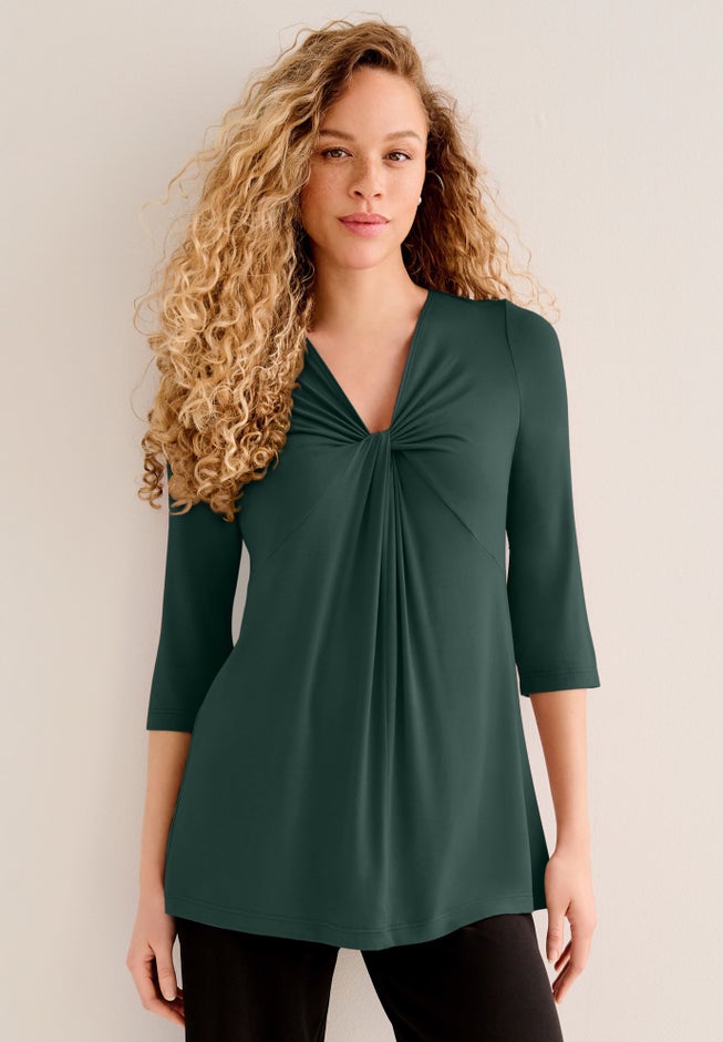 Stretch Knit V-neck 3/4 Sleeve Knot Front Tunic