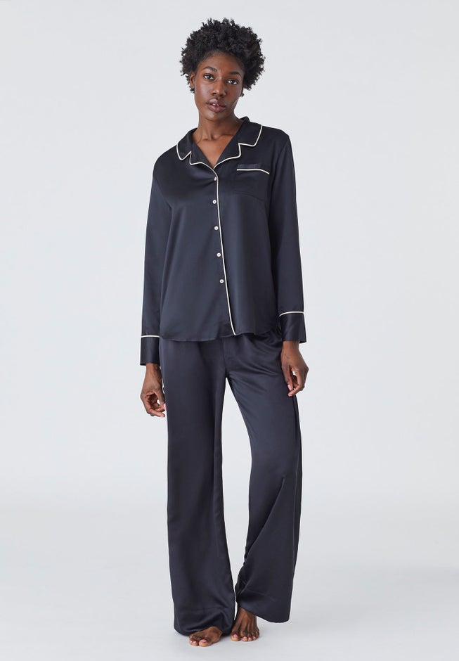 • A stylish pajama set with a relaxed fit, finished with contrast piping and mother-of-pearl buttons
