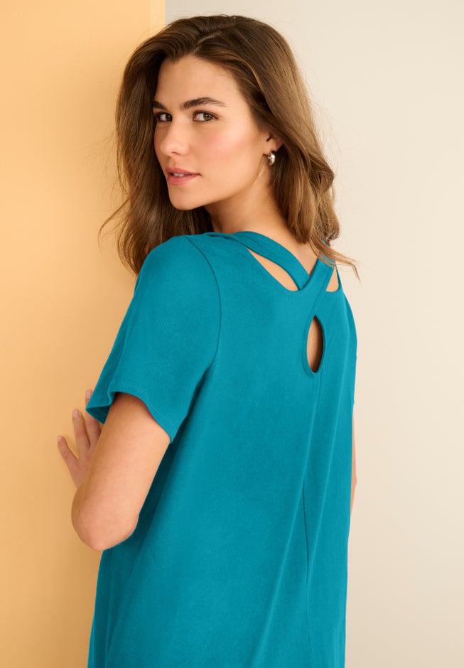 Add an eye-catching upgrade to your tunic collection with this keyhole-back style with pretty crisscross cutouts.