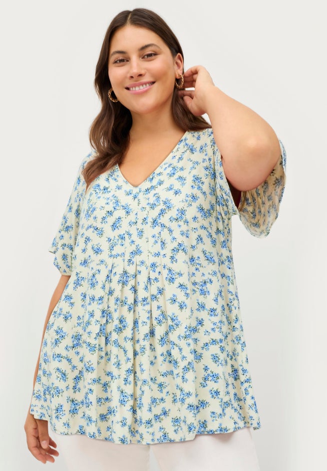 You’re going to love this casual top! This beautifully lightweight and flowy tunic will keep you cool while effortlessly flattering your figure. The flutter sleeves and released pleating at the waist add the perfect feminine touches. Complete the look with jeans and sandals.