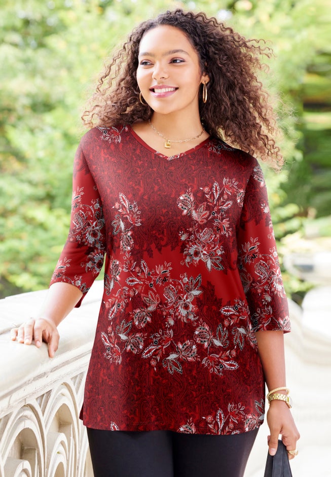 FIT: Relaxed traditional T-shirt fit with V-neckline and 3/4 length sleeves.