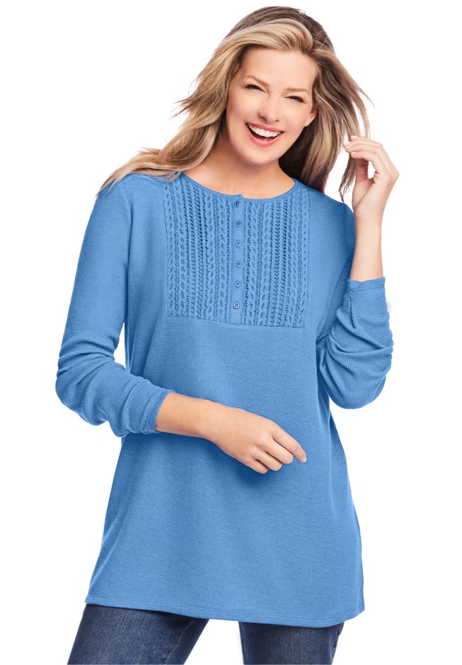 A pretty lace bib makes this Henley tee cute and comfy. This softy textured waffle knit fabric is perfect for all year around.